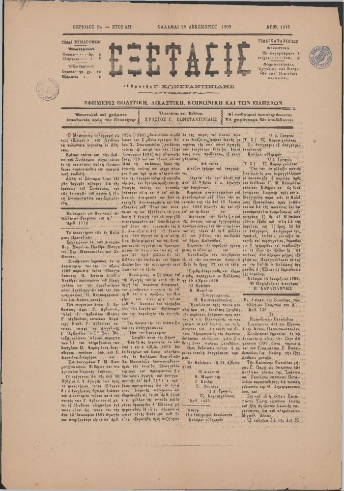 Η ΕΞΕΤΑΣΙΣ φύλλο 22/12/1909