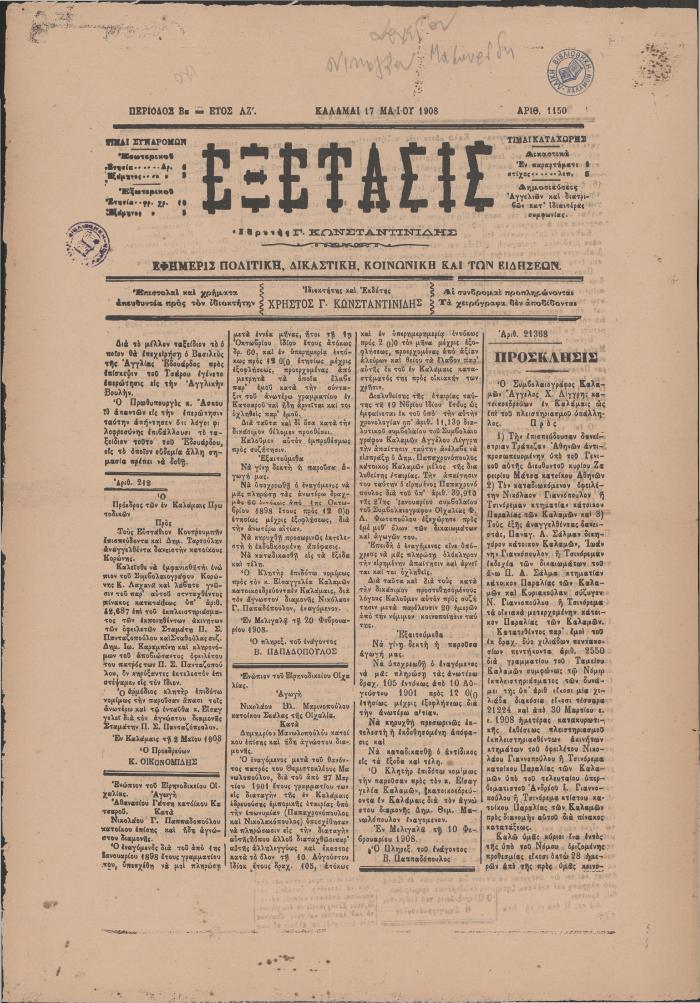 Η ΕΞΕΤΑΣΙΣ φύλλο 17/05/1908