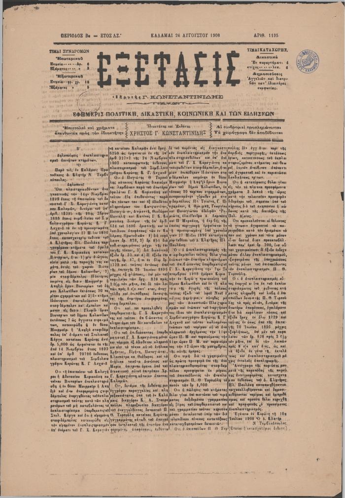 Η ΕΞΕΤΑΣΙΣ φύλλο 26/08/1908