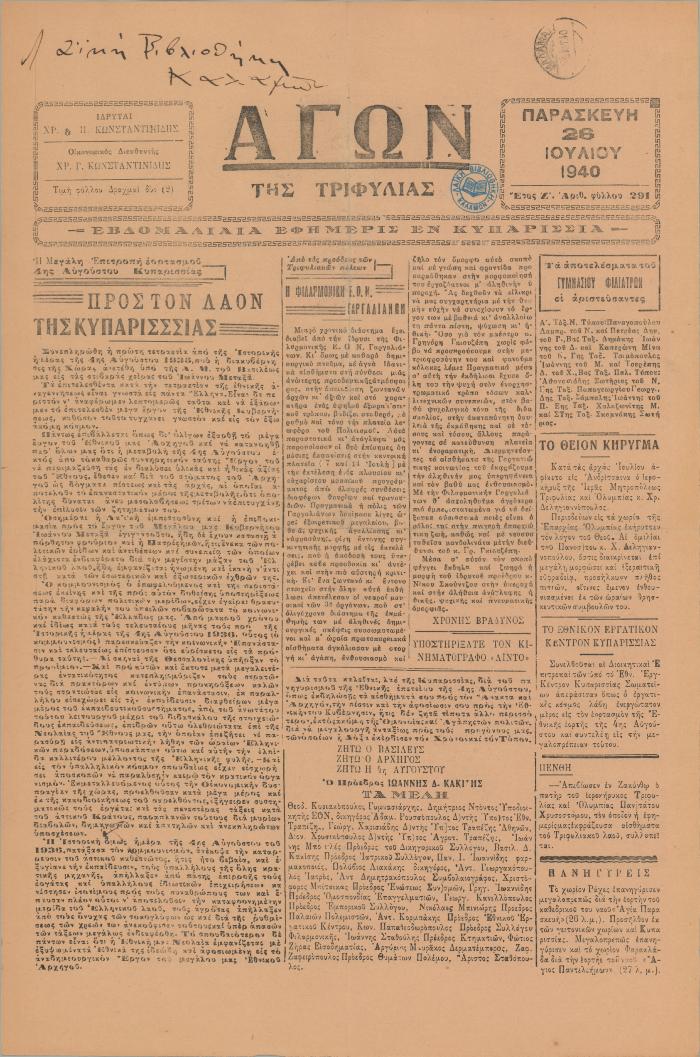 ΑΓΩΝ ΤΗΣ ΤΡΙΦΥΛΙΑΣ φύλλο 26/07/1940