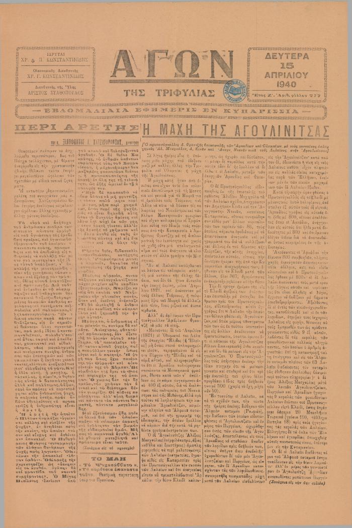 ΑΓΩΝ ΤΗΣ ΤΡΙΦΥΛΙΑΣ φύλλο 15/04/1940