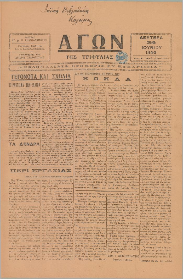 ΑΓΩΝ ΤΗΣ ΤΡΙΦΥΛΙΑΣ φύλλο 24/08/1940